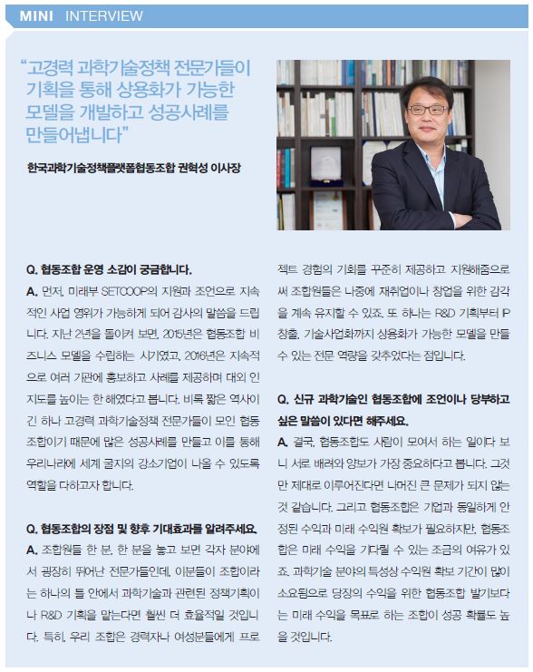 과학기술인협동조합 사례집 관련링크 http://www.setcoop.net/ [관련링크] 페이지 정보 작성일17-01-10 13:02 조회7,232회 본문 미래창조과학부 과학기술인협동조합지원센터(www.setcoop.net)의 협동조합 운영사례 및 보도자료 이전글 다음글 목록
